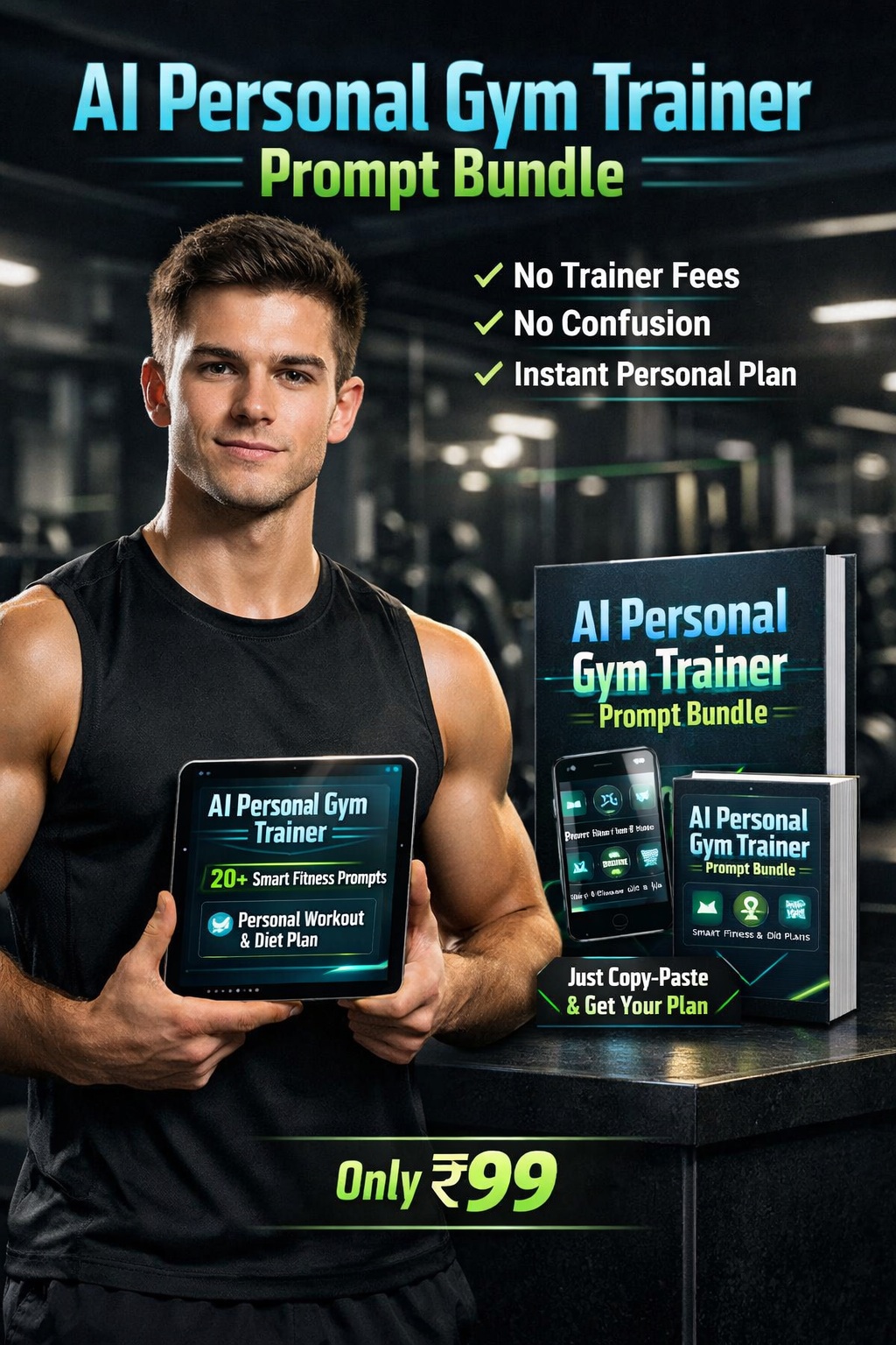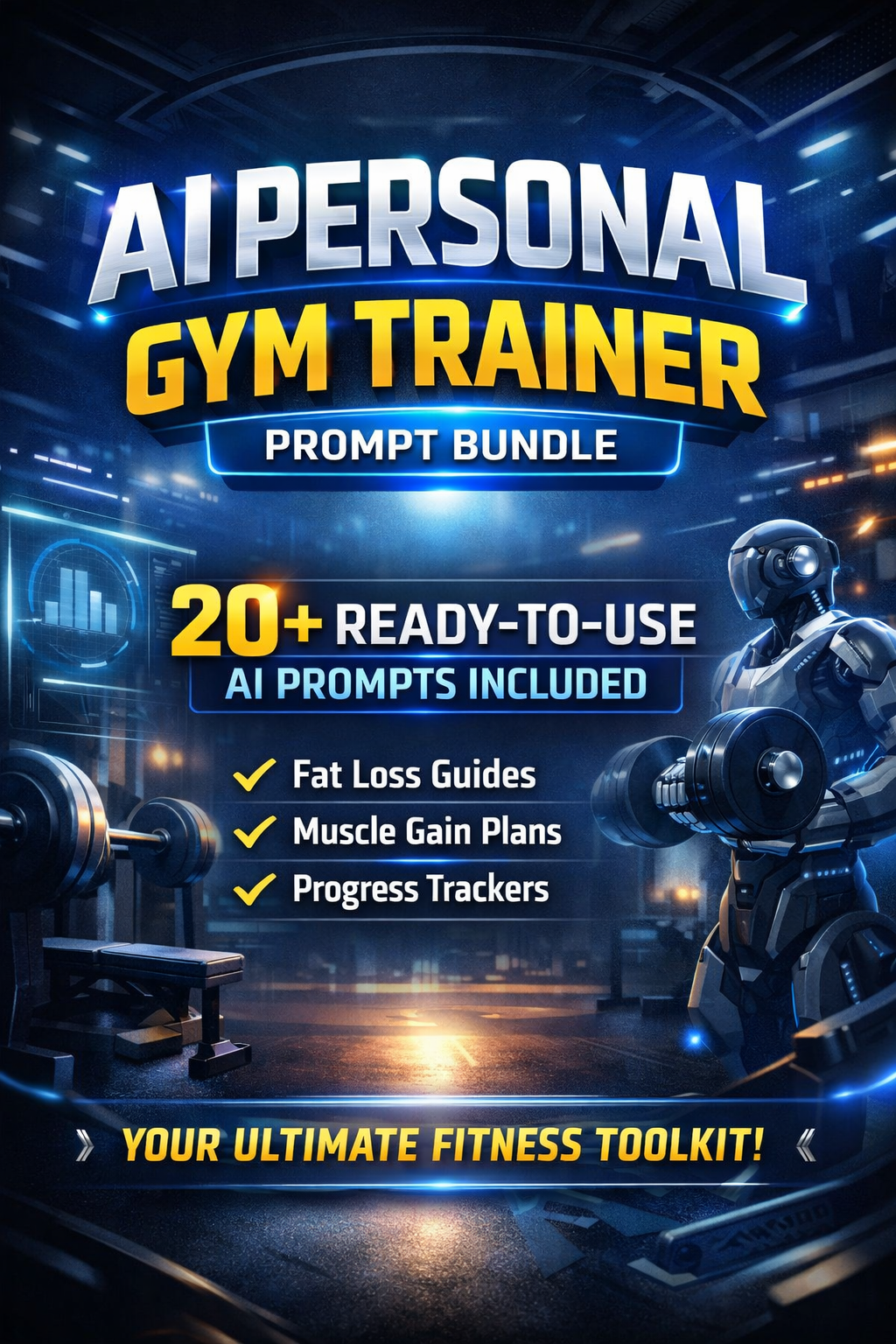 AI Personal Gym Trainer Prompt Bundle ek smart fitness toolkit hai jo gymers aur fitness focused logon ke liye banaya gaya hai jo personalized workout aur diet guidance chahte hain. Is bundle ke prompts ko aap ChatGPT jaise AI tools me use karke apna personal gym trainer bana sakte ho. Chahe aap fat loss, muscle gain, ya balanced fitness goal follow kar rahe ho, ye prompts aapko clear direction aur structured planning dete hain.